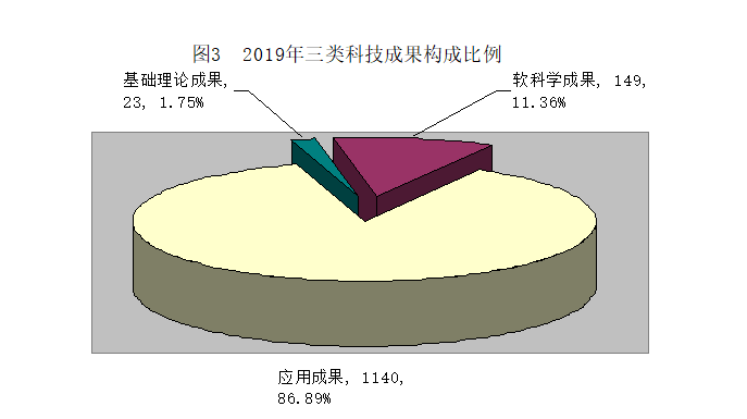 2019年全市登記的科技成果以應(yīng)用技術(shù)為主,共登記應(yīng)用類成果1140項,與去年項數(shù)相比減少了119項,同比減少約9.45%,占全年登記成果總數(shù)的86.89%;登記基礎(chǔ)理論成果23項,與去年項數(shù)相比減少了9項,同比減少約28.13%,占全年登記成果總數(shù)的1.75%;登記軟科學成果149項,與去年項數(shù)相比增加了71項,同比增長了91.03%,占全年登記成果總數(shù)的11.36%。(見圖3)