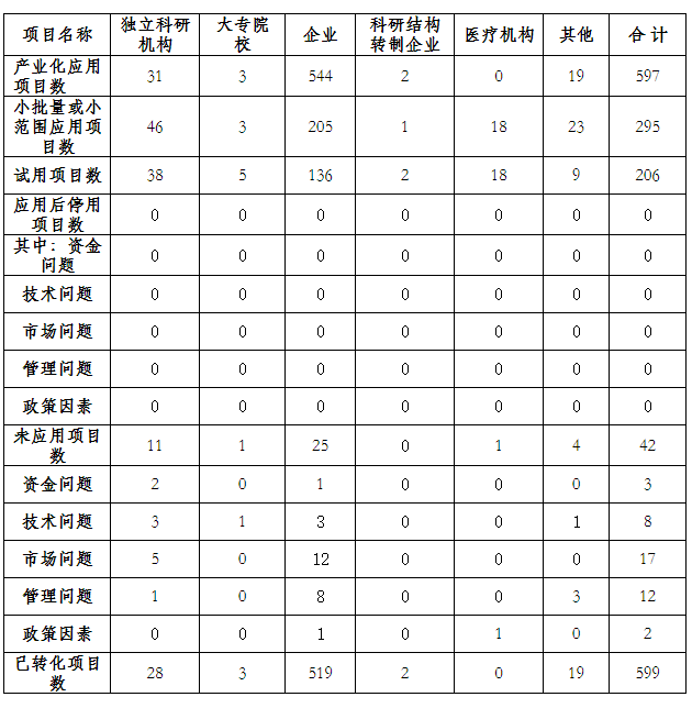 對1140項應(yīng)用技術(shù)成果的應(yīng)用情況進行分類統(tǒng)計,產(chǎn)業(yè)化應(yīng)用項目數(shù)597項,占應(yīng)用技術(shù)成果52.37%,其中,企業(yè)所占產(chǎn)業(yè)化應(yīng)用成果數(shù)最高,其成果數(shù)544項,所占產(chǎn)業(yè)化應(yīng)用比例為91.12%;小批量或小范圍應(yīng)用項目數(shù)295項,占應(yīng)用技術(shù)成果25.88%;試用項目數(shù)206項,占應(yīng)用技術(shù)成果18.07%;應(yīng)用后停用項目目數(shù)0項;未應(yīng)用項目數(shù)42項,占應(yīng)用技術(shù)成果3.68%。(見表7)