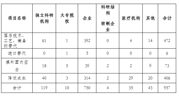 在已統(tǒng)計應(yīng)用成果中,有應(yīng)用效果957項:落后技術(shù)、工藝、裝備的替代472項成果,占有應(yīng)用效果49.32%,其中:企業(yè)有392項成果,占有應(yīng)用效果40.96%。進口替代6項,占有應(yīng)用效果0.63%;填補國內(nèi)空白73項,占有應(yīng)用效果7.63%;降低成本406項,占有應(yīng)用效果42.42%;成果應(yīng)用效果主要集中在企業(yè),其次獨立科研機構(gòu)。(見表8)