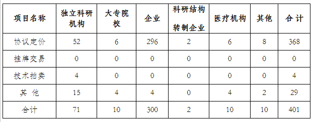 2019年應(yīng)用成果中有成果轉(zhuǎn)移途徑401項,協(xié)議定價368項,占有成果轉(zhuǎn)移途徑91.77%,其中,企業(yè)296項,占73.82%。技術(shù)拍賣4項,占有成果轉(zhuǎn)移途徑0.10%;其他轉(zhuǎn)移29項,占有成果轉(zhuǎn)移途徑7.23%無掛牌交易登記。從上報數(shù)據(jù)分析成果轉(zhuǎn)移途徑形式更趨于市場,企業(yè)成果與其他機構(gòu)相比轉(zhuǎn)化數(shù)量最多。(見表9)