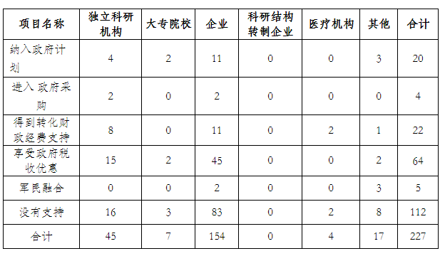 2019年,在有應(yīng)用效果957項中,轉(zhuǎn)化的政府支持227項,占23.72%。其中,納入政府計劃20項,占2.09%;進入政府采購4項,占0.42%;得到轉(zhuǎn)化財政經(jīng)費支持22,占2.30%;享受政府稅收優(yōu)惠64項,占6.69%,軍發(fā)融合5項,占0.52%;沒有支持的112項,占11.70%。企業(yè)和獨立科研機構(gòu)是轉(zhuǎn)化政府支持主體。(見表10 )