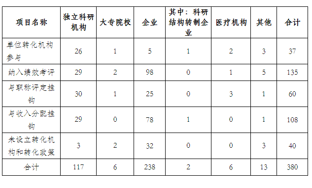 2019年應(yīng)用成果中有本單位轉(zhuǎn)化政策支持380項,占有應(yīng)用成果34.61%,其中,設(shè)立轉(zhuǎn)化機構(gòu)參與37項,占有應(yīng)用成果3.37%;納入績效考評135項,占有應(yīng)用成果12.30%;與職稱評定掛鉤60項,占有應(yīng)用成果5.46%;與個人收入分配掛鉤108項,占有應(yīng)用成果9.84%;未設(shè)立轉(zhuǎn)化機構(gòu)未出臺轉(zhuǎn)化政策40項,占有應(yīng)用成果3.64%。從以上統(tǒng)計得出企業(yè)和獨立科研機構(gòu)轉(zhuǎn)化政策已逐步提升。(見表11 )
