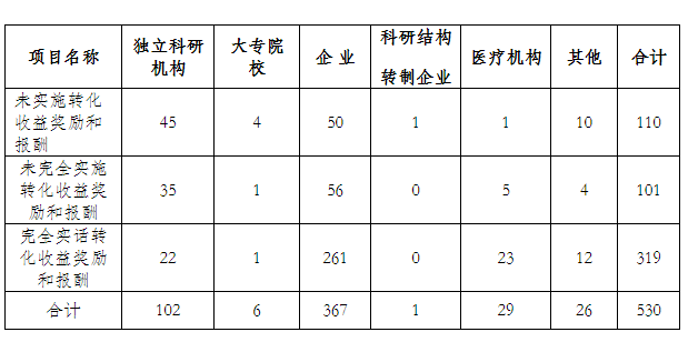 2019年,我市已應(yīng)用成果有轉(zhuǎn)化獎勵和報酬530項,占已應(yīng)用成果48.27%,其中,未實施轉(zhuǎn)化收益獎勵和報酬110項,占有應(yīng)用成果10.02%;未完全實施轉(zhuǎn)化收益獎勵和報酬101項,占有應(yīng)用成果9.20%;完全實施轉(zhuǎn)化收益獎勵和報酬319項,占有應(yīng)用成果29.05%。據(jù)統(tǒng)計,企業(yè)、獨立科研機構(gòu)、其他單位等已激勵科技人員轉(zhuǎn)化收益獎勵。(見表12)
