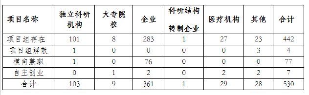2019年,我市已統(tǒng)計應(yīng)用成果中,項目研發(fā)人員狀態(tài)530項,占有應(yīng)用成果48.27%,其中,項目組存在442項,占有應(yīng)用成果40.26%;項目組解散4項,占應(yīng)用成果0.36%;橫向兼職77項,占應(yīng)用成果7.01%,自主創(chuàng)業(yè)7項,占應(yīng)用成果0.64%。,據(jù)統(tǒng)計分析,企業(yè)和獨立科研機構(gòu)的科研人員隊伍基本穩(wěn)定。(見表13)