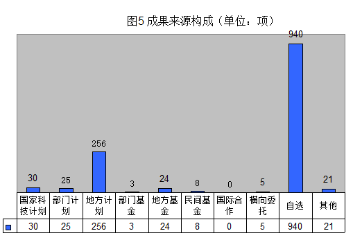 成果來源于國家科技計劃30項,(其中,國家其他科技計劃13項;國家自然科學基金9項;國家科技支撐計劃2項;科技重大專項、國家重點研發(fā)計劃、技術(shù)創(chuàng)新引導(dǎo)計劃、星火計劃、國際科技合作專項、農(nóng)業(yè)科技成果轉(zhuǎn)化資金等6個專項各1項;基地和人才專項、重點基礎(chǔ)研究發(fā)展計劃、高技術(shù)研究發(fā)展計劃、國家重大科學研究計劃、火炬計劃、科技惠民計劃、國家重點新產(chǎn)品計劃、國家軟科學研究計劃、中歐中小企業(yè)節(jié)能減排科研合作基金、創(chuàng)新人才推進計劃、國家重點實驗室、科技基礎(chǔ)條件平臺、國家工程技術(shù)研究中心、科技型中小企業(yè)技術(shù)創(chuàng)新基金、科研院所技術(shù)開發(fā)研究專項、科技富民強縣專項行動計劃、科技基礎(chǔ)性工作專項、國家磁約束核聚變能發(fā)展研究專項、重大科學儀器設(shè)備開發(fā)專項等19個專項中均無成果登記),國家計劃所占比例約2.29%;部門計劃25項,所占比例約1.91%;地方計劃256項,所占比例約19.51%;部門基金3項,所占比例約0.23%;地方基金24項,所占比例約1.83%;民間基金8項,所占比例約0.61%;橫向委托5項,所占比例約0.38%;自選940項,所占比例約71.65%;其它共計21項,所占比例約1.60%;無國際合作立項登記(見圖5)