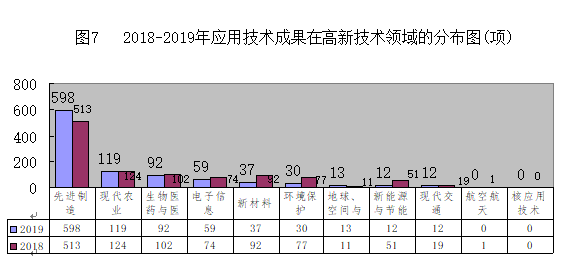 從2019年登記的應(yīng)用成果所屬高新技術(shù)領(lǐng)域分布來分析,成果數(shù)為972項,占應(yīng)用技術(shù)成果數(shù)的85.26%。排名前三的分別是:先進制造598項,占61.52%,位居第一;現(xiàn)代農(nóng)業(yè)119項,占12.24%;生物醫(yī)藥與醫(yī)療器械92項,占9.47%。其他排名依次為:電子信息59項;新材料37項;環(huán)境保護30項;地球、空間與海洋;現(xiàn)代交通和新能源與節(jié)能各12項,今年無航空航天和核應(yīng)用技術(shù)成果登記。從現(xiàn)有成果統(tǒng)計數(shù)據(jù)分析,先進制造、現(xiàn)代農(nóng)業(yè)、生物醫(yī)藥和醫(yī)療器械、電子信息、新材料、環(huán)境保護、地球、空間與海洋等將繼續(xù)是我市重點發(fā)展的高新技術(shù)支柱產(chǎn)業(yè)。(見圖7)
