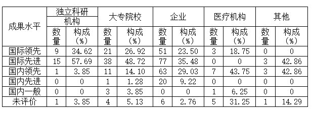 據(jù)統(tǒng)計,2019年成果完成單位中,企業(yè)成果評價水平相對較高,其國際先進水平以上成果達到51項,明顯高于其他類成果完成單位。(見表3)