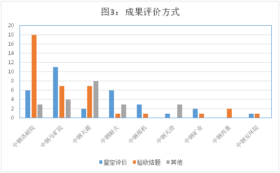2019年中鋼集團(tuán)登記入庫(kù)的科技成果,其評(píng)價(jià)方式以鑒定評(píng)價(jià)和驗(yàn)收結(jié)題為主、其他評(píng)價(jià)方式并存。其中,鑒定評(píng)價(jià)多為外部權(quán)威機(jī)構(gòu)評(píng)價(jià);驗(yàn)收結(jié)題一般是承擔(dān)國(guó)家、省部級(jí)計(jì)劃的課題組組織評(píng)價(jià)或本企業(yè)借助專家組評(píng)審組織評(píng)價(jià)。各所屬企業(yè)成果評(píng)價(jià)方式見下圖3。