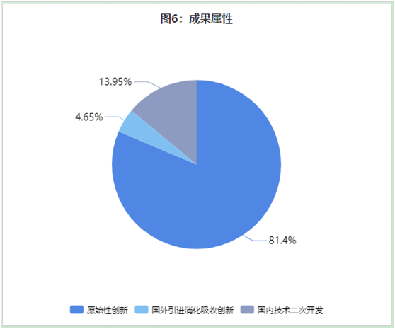 2019年中鋼集團(tuán)登記入庫(kù)的應(yīng)用技術(shù)類成果,原始性創(chuàng)新類項(xiàng)目達(dá)70項(xiàng),占應(yīng)用技術(shù)類成果總數(shù)的81.4%(詳見圖6)。中鋼集團(tuán)所屬企業(yè)在應(yīng)用技術(shù)類成果中展示的原始性創(chuàng)新能力較強(qiáng)。這些成果中,達(dá)到國(guó)際領(lǐng)先水平的有10項(xiàng),國(guó)際先進(jìn)水平的有13項(xiàng),國(guó)內(nèi)領(lǐng)先水平的有23項(xiàng),國(guó)內(nèi)先進(jìn)水平的有2項(xiàng)。