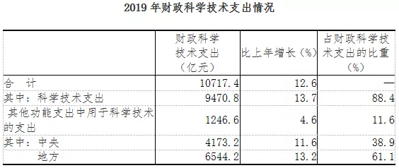 2019年,國(guó)家財(cái)政科學(xué)技術(shù)支出10717.4億元,比上年增加1199.2億元,增長(zhǎng)12.6%。其中,中央財(cái)政科學(xué)技術(shù)支出4173.2億元,增長(zhǎng)11.6%,占財(cái)政科學(xué)技術(shù)支出的比重為38.9%;地方財(cái)政科學(xué)技術(shù)支出6544.2億元,增長(zhǎng)13.2%,占比為61.1%。