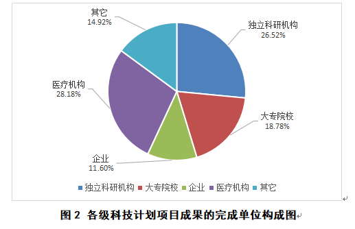 據(jù)統(tǒng)計(jì),各級(jí)科技計(jì)劃項(xiàng)目成果完成單位分布主要集中在醫(yī)療機(jī)構(gòu)、獨(dú)立科研機(jī)構(gòu)、大專院校和企業(yè),其中,醫(yī)療機(jī)構(gòu)完成的成果所占比最高,為28.18%;其次是獨(dú)立科研機(jī)構(gòu),為26.52%;再次是大專院校,為18.78%;企業(yè)為11.60%。見(jiàn)圖2: