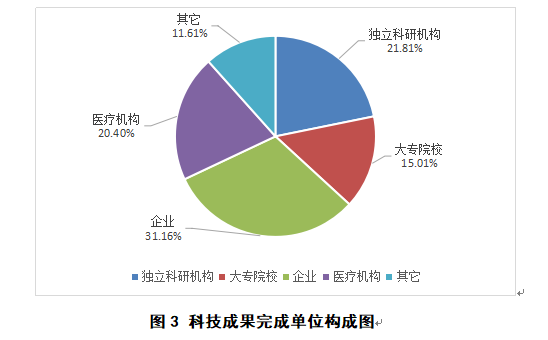 2020年度登記的353項(xiàng)科技成果中,由企業(yè)完成110項(xiàng),占31.16%;獨(dú)立科研機(jī)構(gòu)完成77項(xiàng),占成果總數(shù)的21.81%;醫(yī)療機(jī)構(gòu)完成72項(xiàng),占20.40%;大專院校完成53項(xiàng),占15.01%;其它單位完成41項(xiàng),占11.61%。見(jiàn)圖3: