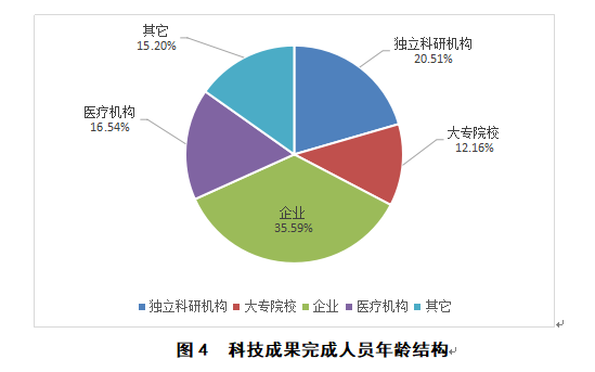 (1)2020年度登記的科技成果涉及到的完成人員共3973人次,比上年增長(zhǎng)11.85%。從單位屬性看,企業(yè)科技成果完成人員為1414人,占完成人員總數(shù)的35.59%;獨(dú)立科研機(jī)構(gòu)成果完成人員為815人次,占登記總數(shù)的20.51%;醫(yī)療機(jī)構(gòu)成果完成人員為657人,占登記總數(shù)的16.54%;大專院校成果完成人員分別為483人,占登記總數(shù)的12.16%;其它人員為604人,占登記總數(shù)的15.20%。可見(jiàn),企業(yè)和獨(dú)立科研機(jī)構(gòu)是科學(xué)技術(shù)研究的主體。見(jiàn)圖4: