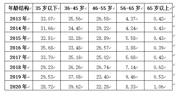 表1:2013-2020年科技成果完成人員年齡結(jié)構(gòu)(%)