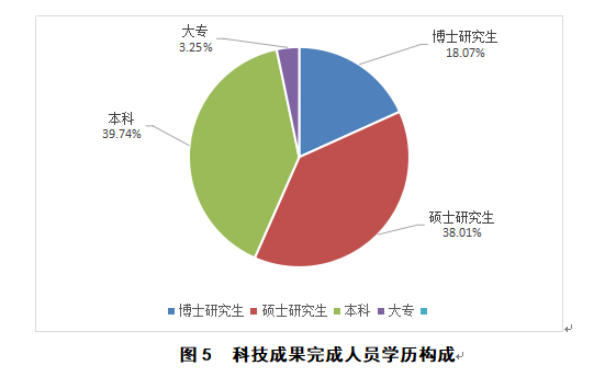 (2)從學(xué)歷構(gòu)成看,2020年登記的科技成果完成人員中,博士研究生為718人次,占全部人次的18.07%;碩士研究生為1510人次,占38.01%;大學(xué)本科及以下學(xué)歷人員1745人次,占43.92%(見(jiàn)圖5)。博士研究生、碩士研究生比例略有下降趨勢(shì),大學(xué)本科及以下學(xué)歷人員呈上升趨勢(shì)。見(jiàn)表2: