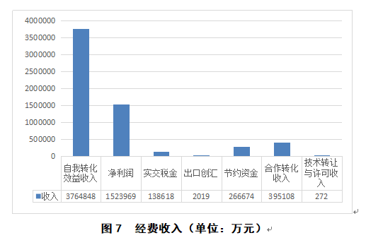 (1)2020年353項(xiàng)科技成果自我轉(zhuǎn)化效益合計(jì)收入3764848萬(wàn)元。其中,凈利潤(rùn)1523969萬(wàn)元,占收入總額的40.48%;實(shí)交稅金138618萬(wàn)元,占收入總額的3.68%;出口創(chuàng)匯2019萬(wàn)元,占收入總額的0.05%;節(jié)約資金266674萬(wàn)元,占收入總額的7.08%;合作轉(zhuǎn)化收入395108萬(wàn)元,占收入總額的10.49%;技術(shù)轉(zhuǎn)讓與許可收入272萬(wàn)元,占收入總額0.01%。如圖7: