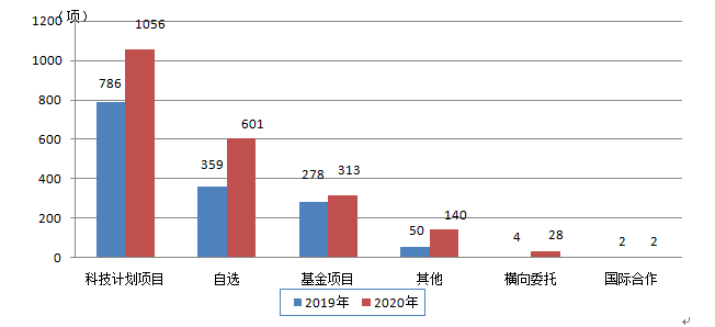 2020年,全省登記的科技成果以各類科技計(jì)劃項(xiàng)目為主,政府資金起主導(dǎo)作用,其中來源于各類科技計(jì)劃項(xiàng)目的成果1056項(xiàng),比上年增長(zhǎng)34.4%,占登記成果總數(shù)的49.3%;自選項(xiàng)目601項(xiàng),比上年增長(zhǎng)67.4%,占28.1%;基金項(xiàng)目313項(xiàng),比上年增長(zhǎng)12.6%,占14.6%;橫向委托28項(xiàng),比上年增加24項(xiàng),占1.3%;其他項(xiàng)目140項(xiàng),比上年增長(zhǎng)了1.8倍,占6.5%;國(guó)際合作2項(xiàng),與上年對(duì)比無變化。