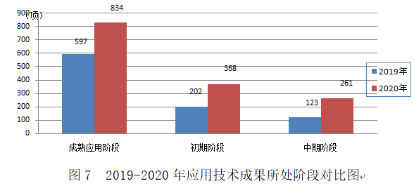 在1463項(xiàng)應(yīng)用技術(shù)成果中,834項(xiàng)成果處于成熟應(yīng)用階段,占57.0%;368項(xiàng)成果處于初期階段,占25.2%;261項(xiàng)成果處于中期階段,占17.8%。