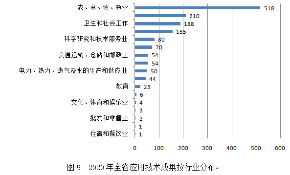 從成果應(yīng)用的國(guó)民經(jīng)濟(jì)行業(yè)來看,1463項(xiàng)應(yīng)用技術(shù)成果,廣泛應(yīng)用在17個(gè)行業(yè)中,其中,在農(nóng)林牧漁業(yè)、制造業(yè)、衛(wèi)生和社會(huì)工作、信息傳輸/軟件和信息技術(shù)服務(wù)業(yè)四個(gè)行業(yè)中科技成果應(yīng)用的最多,科技成果數(shù)量依次為518項(xiàng)、210項(xiàng)、188項(xiàng)和155項(xiàng),這四個(gè)行業(yè)的科技成果占應(yīng)用技術(shù)成果總量的73.2%。