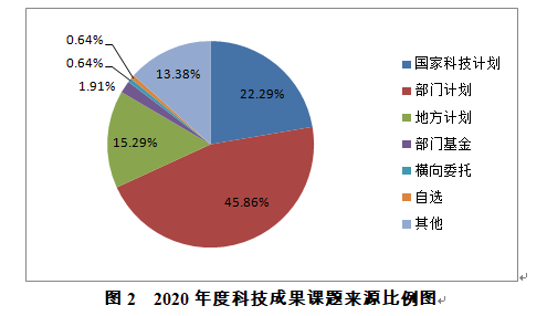 登記的157項(xiàng)科技成果中,國家科技計(jì)劃35項(xiàng),占全年總數(shù)22.29%;部門計(jì)劃72項(xiàng),占全年總數(shù)45.86%。地方計(jì)劃24項(xiàng),占全年總數(shù)15.29%;橫向委托1項(xiàng),占全年0.72%,部門基金3項(xiàng),占全年總數(shù)1.91%。自選1項(xiàng),占全年總數(shù)0.72%;其他21項(xiàng),占全年總數(shù)13.38%。