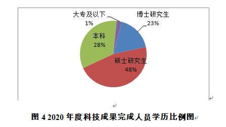 在完成項(xiàng)目人員文化程度方面,博士研究生498人次,占全部人員22.53%;碩士研究生1070人次,占全部人員48.42%;本科生615人次,占全部人員27.83%;大專生及以下27人次,占全部人員的1.22%。碩士研究生及以上人員超過70%,是科研的中堅(jiān)力量。