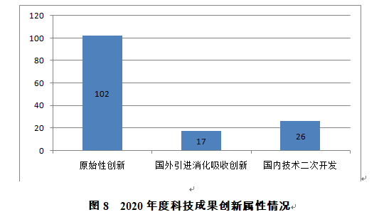 從成果創(chuàng)新屬性上來看,原始性創(chuàng)新成果共102項(xiàng),占可統(tǒng)計(jì)數(shù)據(jù)的70.34%;國外引進(jìn)消化吸收創(chuàng)新成果為17項(xiàng),占可統(tǒng)計(jì)數(shù)據(jù)的11.72%;國內(nèi)技術(shù)二次開發(fā)的成果為26項(xiàng),占可統(tǒng)計(jì)數(shù)據(jù)的17.93%。其中原始性創(chuàng)新成果占比較去年增長了八個(gè)百分點(diǎn),體現(xiàn)了市場監(jiān)管系統(tǒng)科研單位自主科技創(chuàng)新能力的不斷提升。