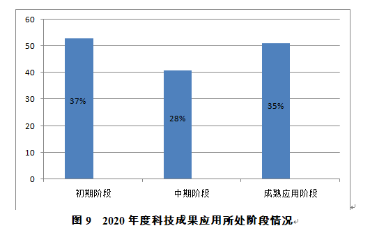 從應(yīng)用情況分析,初期階段為53項(xiàng),占可統(tǒng)計(jì)數(shù)據(jù)的36.55%;中期間段為41項(xiàng),占可統(tǒng)計(jì)數(shù)據(jù)的28.28%;成熟應(yīng)用階段為51項(xiàng),占可統(tǒng)計(jì)數(shù)據(jù)的35.17%。當(dāng)前成果應(yīng)用階段并沒有顯示出明顯差異,應(yīng)繼續(xù)加強(qiáng)科技成果轉(zhuǎn)化,推動(dòng)科技成果向成熟應(yīng)用階段發(fā)展。
