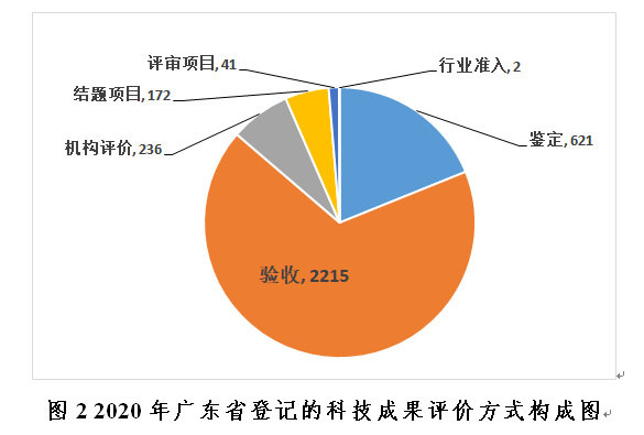 2020年登記的科技成果中,評(píng)價(jià)方式為項(xiàng)目驗(yàn)收的有2215項(xiàng),占2020年成果登記總數(shù)的67.08%,較2019年增加了437項(xiàng),增長率達(dá)24.58%;評(píng)價(jià)方式為鑒定和機(jī)構(gòu)評(píng)價(jià)的有621項(xiàng)和236項(xiàng),占2020年登記成果總數(shù)的18.81%和7.15%,評(píng)價(jià)方式為評(píng)審、行業(yè)準(zhǔn)入、評(píng)估、結(jié)題、知識(shí)產(chǎn)權(quán)的分別為41項(xiàng)、2項(xiàng)、15項(xiàng)、172項(xiàng)和0項(xiàng)。2020年登記成果的評(píng)價(jià)方式呈現(xiàn)以驗(yàn)收方式為主、鑒定方式為輔的特點(diǎn)(見圖2)。