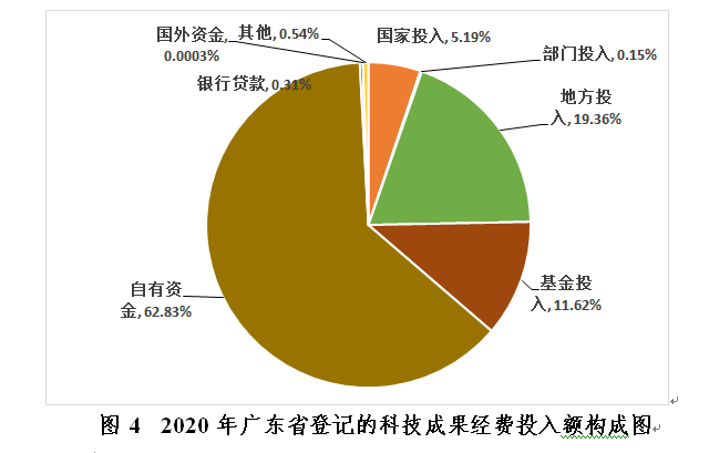 2020年廣東省登記的科技成果投經(jīng)費(fèi)總額達(dá)1724.96億元,以自有資金投入為主,達(dá)1083.71億元,占2020年經(jīng)費(fèi)來源投入總額的62.83%;其次,地方投入333.91億元,基金投入200.47億元,國家投入89.45億元,其他投入9.39億元,銀行貸款5.4億元,部門投入2.61億元,國外資金投入0.005億元(見圖4)。
