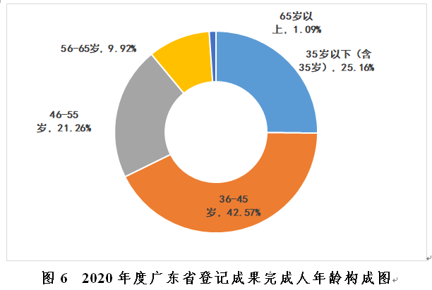 5.青年人員為創(chuàng)新骨干。29985名成果完成人中,35歲以下(含35歲)的7545人次,占總數(shù)的25.16%;36~45歲的12764人次,占總數(shù)的42.57%,兩項(xiàng)合計(jì)67.73%。青年人員已成為創(chuàng)新的主要力量。