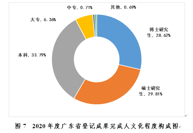 2020年廣東省登記成果其完成人共計(jì)29985人次,主要集中在45歲以下人員,占研究總?cè)藬?shù)的67.73%(見圖6)。博士研究生、碩士研究生、本科學(xué)歷分別占總數(shù)的28.62%、29.81%、33.79%(見圖7)。