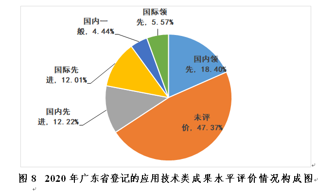 從成果水平看,所登記的應(yīng)用技術(shù)類科技成果中達(dá)國際領(lǐng)先的128項(xiàng)、達(dá)國際先進(jìn)的276項(xiàng)、達(dá)國內(nèi)領(lǐng)先的423項(xiàng)、達(dá)國內(nèi)先進(jìn)的281項(xiàng)、國內(nèi)一般的102項(xiàng)、未評(píng)價(jià)的1089項(xiàng),其比例分別為5.57%、12.01%、18.40%、12.22%、4.44%、47.37%,達(dá)到國內(nèi)先進(jìn)水平及以上的成果合計(jì)48.19%(見圖8)。