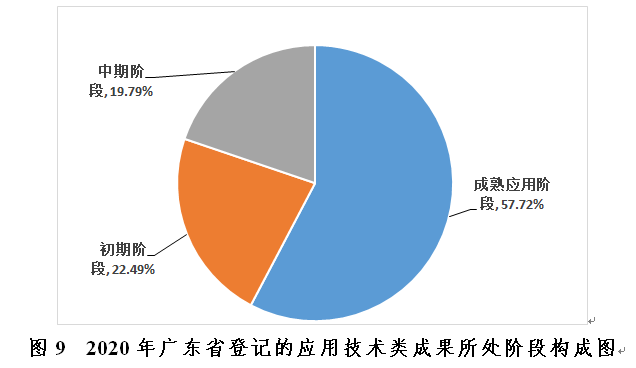 2020年廣東省科技成果統(tǒng)計(jì)數(shù)據(jù)顯示,在所登記的應(yīng)用技術(shù)類科技成果中,處于初期階段、中期階段、成熟應(yīng)用階段成果項(xiàng)目數(shù)分別為517項(xiàng)、455項(xiàng)和1327項(xiàng),達(dá)到成熟應(yīng)用階段的成果占比達(dá)57.72%,說明2020年廣東省應(yīng)用技術(shù)類成果整體的技術(shù)成熟度較高(見圖9)。