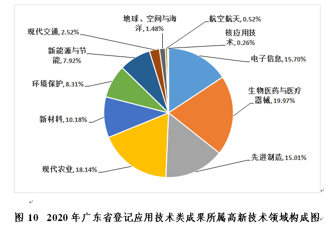 2020年廣東省登記的應(yīng)用技術(shù)類科技成果中,高新技術(shù)領(lǐng)域成果達(dá)到2299項(xiàng),主要分布在生物醫(yī)藥與醫(yī)療器械、現(xiàn)代農(nóng)業(yè)、電子信息、先進(jìn)制造、新材料五個(gè)領(lǐng)域,所占比例依次是:19.97%、18.14%、15.70%、15.01%、10.18%,其他領(lǐng)域占比較低(見圖10)。