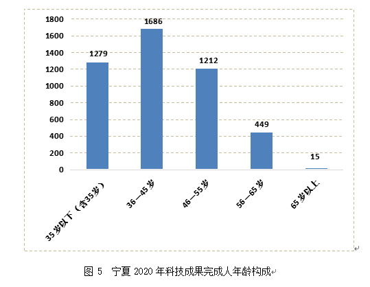 從年齡結(jié)構(gòu)來看,中青年是科技成果研究人員的主體,55歲以下占90.0%,其中45歲以下2965人次,占總?cè)藬?shù)的比重接近2/3,46-55歲1212人次,占比超過1/4,與2019年相比,科技成果完成人年齡結(jié)構(gòu)變化不大,與全國平均水平相比,寧夏的科技成果完成人更趨于年輕化。