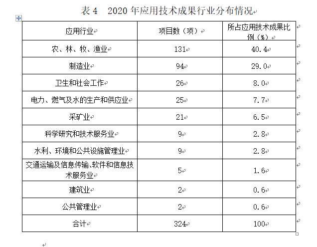 324項(xiàng)應(yīng)用技術(shù)成果按行業(yè)分布,農(nóng)、林、牧、漁業(yè)131項(xiàng)、制造業(yè)94項(xiàng)、衛(wèi)生和社會(huì)工作26項(xiàng)、電力、燃?xì)饧八纳a(chǎn)和供應(yīng)業(yè)25項(xiàng)、采礦業(yè)21項(xiàng)、科學(xué)研究和技術(shù)服務(wù)業(yè)9項(xiàng)、水利、環(huán)境和公共設(shè)施管理業(yè)9項(xiàng)、交通運(yùn)輸及信息傳輸、軟件和信息技術(shù)服務(wù)業(yè)5項(xiàng)、建筑業(yè)2項(xiàng)、公共管理業(yè)2項(xiàng)(見表4)。數(shù)據(jù)表明,我區(qū)科技成果主要分布在農(nóng)林牧漁業(yè),制造業(yè),衛(wèi)生和電力熱力燃?xì)夤?yīng)等行業(yè)。