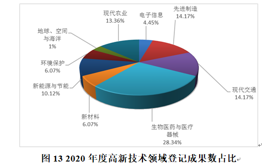 在2020年度所登記的520項(xiàng)應(yīng)用技術(shù)成果中,屬于高新技術(shù)領(lǐng)域的247項(xiàng),占應(yīng)用技術(shù)成果的47.5%,其中電子信息11項(xiàng),先進(jìn)制造35項(xiàng),現(xiàn)代交通35項(xiàng),生物醫(yī)藥與醫(yī)療器械70項(xiàng),新材料15項(xiàng),新能源與節(jié)能25項(xiàng),環(huán)境保護(hù)15項(xiàng),地球、空間和海洋8項(xiàng),現(xiàn)代農(nóng)業(yè)33項(xiàng)。