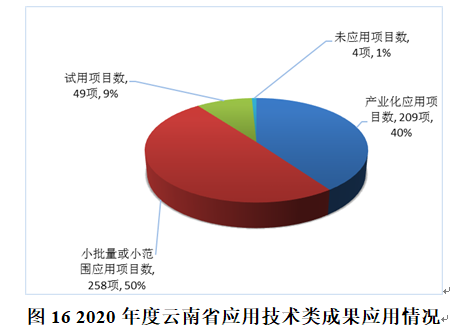 在2020年度所登記的520項(xiàng)應(yīng)用技術(shù)成果中,產(chǎn)業(yè)化應(yīng)用項(xiàng)目數(shù)209項(xiàng),占所登記應(yīng)用技術(shù)成果的40.19%;小批量或小范圍應(yīng)用項(xiàng)目數(shù)258項(xiàng),占49.62%;試用項(xiàng)目數(shù)49項(xiàng),占9.42%;未應(yīng)用項(xiàng)目數(shù)4項(xiàng),占0.77%。