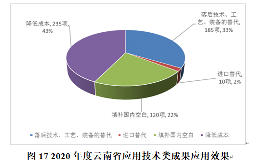 在2020年度所登記的應(yīng)用技術(shù)成果中,550項(xiàng)成果應(yīng)用后已產(chǎn)生實(shí)際效果,其中:落后技術(shù)、工藝、裝備的替代有185項(xiàng),占33.64%;實(shí)現(xiàn)進(jìn)口替代的有10項(xiàng),占1.82%;填補(bǔ)國內(nèi)空白的有120項(xiàng),占21.82%;實(shí)現(xiàn)降低成本的有235項(xiàng),占42.73%。
