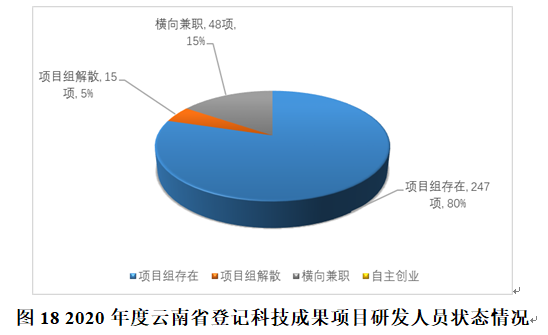 在2020年度所登記的應(yīng)用技術(shù)成果轉(zhuǎn)化過程中,有310項(xiàng)成果填報(bào)了項(xiàng)目組在該成果進(jìn)行登記時(shí)的狀態(tài)情況,其中:項(xiàng)目組基本完整保持的為247項(xiàng),占79.68%;項(xiàng)目組解散的為15項(xiàng),占4.84%;橫向兼職的為48項(xiàng),占15.48%;自主創(chuàng)業(yè)的為0項(xiàng)。