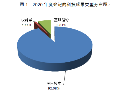 2020年度河南省共登記科技成果2524項(xiàng),其中應(yīng)用技術(shù)類成果2324項(xiàng),占全部成果的92.08%;基礎(chǔ)理論類成果172項(xiàng),占全部成果的6.81%;軟科學(xué)類成果28項(xiàng),占全部成果的1.11%。