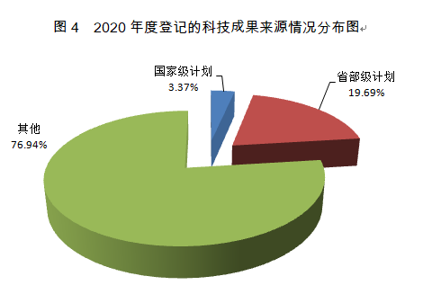 2020年度河南省登記的2524項(xiàng)成果中,來自國(guó)家級(jí)計(jì)劃項(xiàng)目的有85項(xiàng),占3.37%,來自省部級(jí)計(jì)劃項(xiàng)目的497項(xiàng),占19.69%,其他類項(xiàng)目1942項(xiàng),占76.94%。