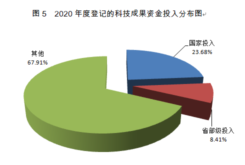 2020年度河南省登記的2524項(xiàng)成果中,共投入資金69.0028億元,其中國(guó)家投入16.3424億元,占23.68%;省部級(jí)投入5.8001億元,占8.41%;其他資金投入46.8603億元,占67.91%。項(xiàng)目資金投入主要來自于項(xiàng)目承擔(dān)單位。