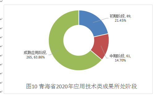 415項(xiàng)應(yīng)用技術(shù)成果中,如圖10所示,處于成熟應(yīng)用階段的成果265項(xiàng),占63.86%,初期階段成果89項(xiàng),中期階段成果61項(xiàng)。