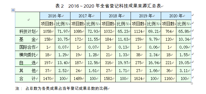 登記的成果主要以各級(jí)財(cái)政支持的各類(lèi)計(jì)劃項(xiàng)目為主,其中來(lái)源于各級(jí)科技計(jì)劃項(xiàng)目的成果764項(xiàng),占登記成果總數(shù)的65.86%;基金項(xiàng)目120項(xiàng),占登記成果總數(shù)的10.34%;國(guó)際合作項(xiàng)目1項(xiàng),占登記成果總數(shù)的0.09%;橫向委托項(xiàng)目18項(xiàng),占登記成果總數(shù)的1.55%;自選項(xiàng)目221項(xiàng),占登記成果總數(shù)的19.05%;其他項(xiàng)目36項(xiàng),占登記成果總數(shù)的3.11%。表2列出了2016~2020年全省登記科技成果來(lái)源情況。