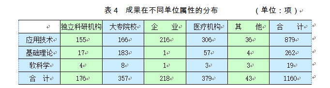 本年度登記的成果仍以應(yīng)用類(lèi)為主,應(yīng)用技術(shù)成果總計(jì)879項(xiàng),占登記成果總數(shù)的75.77%;基礎(chǔ)理論成果為262項(xiàng),占登記總數(shù)的22.59%;軟科學(xué)成果為19項(xiàng),占登記總數(shù)的1.64%(見(jiàn)表3、圖1)。2020年軟科學(xué)成果占比明顯減少,與之相對(duì)應(yīng)的,基礎(chǔ)理論成果占比明顯上升。各類(lèi)成果在不同屬性單位的分布見(jiàn)表4。