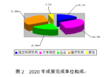 2020年度登記的1160項(xiàng)成果中,第一完成單位占比最高的是醫(yī)療機(jī)構(gòu)366項(xiàng),占31.55%;大專(zhuān)院校357項(xiàng),占30.78%;企業(yè)218項(xiàng),占18.79%;獨(dú)立科研機(jī)構(gòu)176項(xiàng),占15.17%;其他43項(xiàng),占3.71%(見(jiàn)圖2)。
