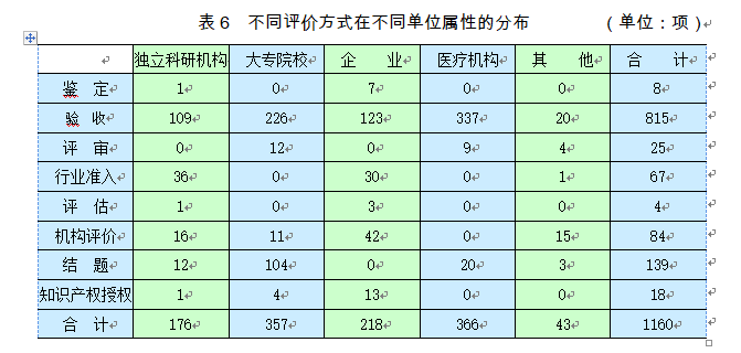 1160項(xiàng)登記成果中,鑒定項(xiàng)目數(shù)8項(xiàng),驗(yàn)收項(xiàng)目數(shù)815項(xiàng),評(píng)審項(xiàng)目數(shù)25項(xiàng),行業(yè)準(zhǔn)入項(xiàng)目數(shù)67項(xiàng),評(píng)估項(xiàng)目數(shù)4項(xiàng),機(jī)構(gòu)評(píng)價(jià)項(xiàng)目數(shù)84項(xiàng),結(jié)題項(xiàng)目數(shù)139項(xiàng),知識(shí)產(chǎn)權(quán)授權(quán)項(xiàng)目數(shù)18項(xiàng),分別占登記成果總數(shù)的0.69%、70.26%、2.16%、5.78%、0.34%、7.24%、11.98%、1.55%。不同評(píng)價(jià)方式在不同單位屬性的分布情況見(jiàn)表6。