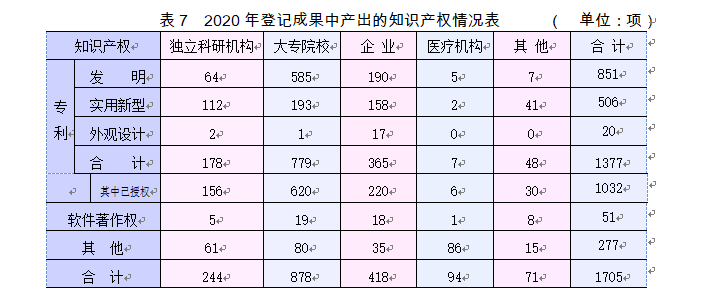 本年度登記的科技成果中,成果研究過(guò)程中產(chǎn)出知識(shí)產(chǎn)權(quán)數(shù)為1705項(xiàng),其中發(fā)明專(zhuān)利851項(xiàng),實(shí)用新型專(zhuān)利506項(xiàng),外觀設(shè)計(jì)專(zhuān)利20項(xiàng),軟件著作權(quán)51項(xiàng),其他277項(xiàng)。在專(zhuān)利中已授權(quán)專(zhuān)利為1032項(xiàng),占專(zhuān)利總數(shù)的74.95%。各類(lèi)知識(shí)產(chǎn)權(quán)在不同屬性單位的分布情況見(jiàn)表7。