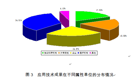 本年度登記的應(yīng)用科技成果總計(jì)為879項(xiàng),其中獨(dú)立科研機(jī)構(gòu)完成的為155項(xiàng),大專(zhuān)院校完成的為166項(xiàng),企業(yè)完成的為216項(xiàng),醫(yī)療機(jī)構(gòu)完成的為306項(xiàng),其他部門(mén)完成的為36項(xiàng),分別占應(yīng)用技術(shù)成果的17.63%、18.89%、24.57%、34.81%、4.10%(見(jiàn)圖3)。